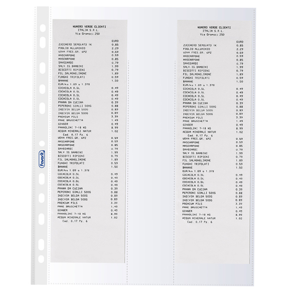 Buste a foratura porta scontrini fiscali realizzate in polipropilene con finitura buccia d'arancia anti-riflesso. 3 strati con foratura e banda rinforzata. Contengono 3+3 tasche per scontrini larghi 7 cm. o 2+2 tasche per scontrini di 8 cm. Tasche con apertura dall'alto e spessore medio con un'ottima resistenza. Made in Italy.