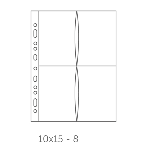 Buste porta foto realizzate in PP liscio. Il divisorio trasparente permette di vedere entrambi i lati. Formato esterno 21x29,7cm. Contiene 8 foto da 10x15cm (4 per lato) inserimento della foto laterale.