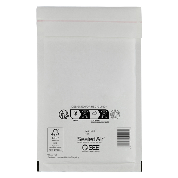 Busta imbottita dallo strato esterno in carta vergine certificata FSC e lo strato interno in polietilene a bolle d'aria. Particolarmente resistente, chiusura con strip autoadesivo. Le buste imbottite MAIL LITE possono essere riciclate separando facilmente la carta esterna dallo strato di bolle interno. La carta non politenata puo' essere riciclata nel flusso di rifiuti di carta, la bolla puo' essere riutilizzata come imballaggio o riciclata adeguatamente nella plastica. Dimensioni: Formato interno 24x33cm. Formato esterno 26x39cm.