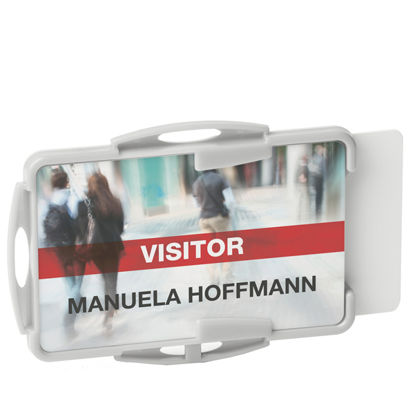 Portabadge ideale per 2 tessere. Realizzato in plastica riciclata certificata Blue Angel. Puo' essere utilizzato sia in formato orizzontale che verticale. Puo' essere utilizzato con catenella, cordoncino in tessuto o chiocciola yo-yo . Dimensioni interne: 54 x 87 mm.