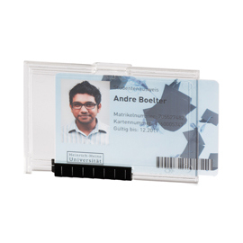 Elegante portabadge con comparti separati per contenere e proteggere 1 tessera formato 54x87mm. Utilizzabile sia in posizione orizzontale sia verticale. Perfetto per proteggere tessere con chip RFID e con banda magnetica. Levette scorrevoli per una facile espulsione delle tessere. In plastica trasparente crystal-clear di alta qualita'.