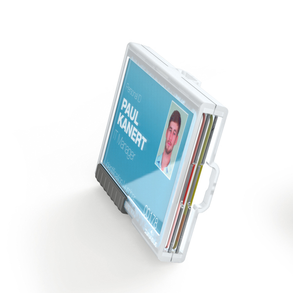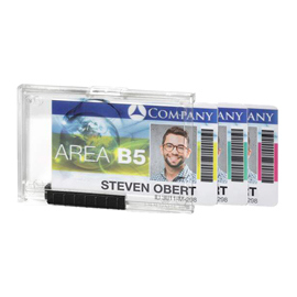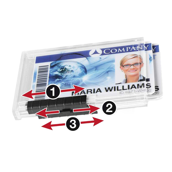 Elegante portabadge con comparti separati per contenere e proteggere fino a 3 tessere formato 54x87mm. Utilizzabile sia in posizione orizzontale sia verticale. Perfetto per proteggere tessere con chip RFID e con banda magnetica. Levette scorrevoli per una facile espulsione delle tessere. In plastica trasparente crystal-clear di alta qualita'.