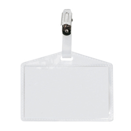 Porta nomi in PP a buccia completi di pinzette in metallo (a pinza), ma senza cartoncino. Apertura lato corto (laterale) Adatti a congressi, riunioni, visite guidate. Formato 95x60mm.