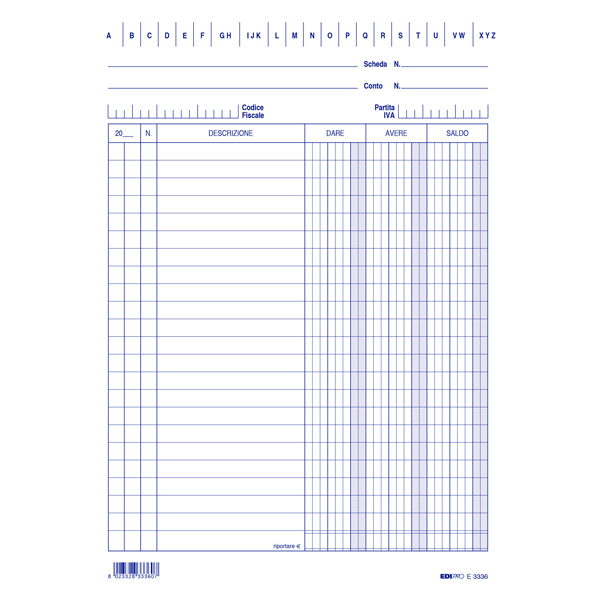 100 schede in cartoncino da 170gr. Formato 21x15cm verticale. Dare/avere/saldo.