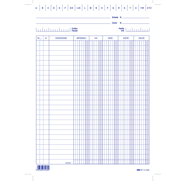 100 schede in cartoncino da 170gr. Formato 24x17cm verticale. Dare/avere/saldo.