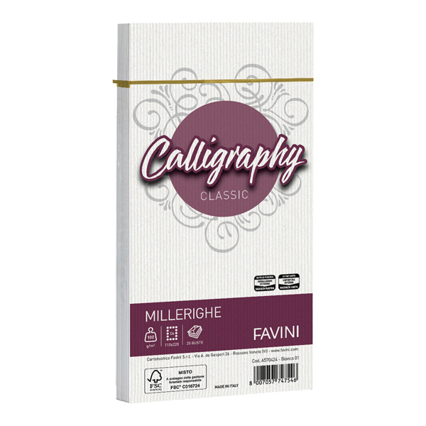 Busta adesiva con strip da 100 grammi in carta Calligraphy con tramatura millerighe. Formato 110x220mm.