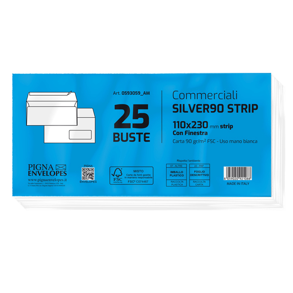 Busta bianca internografata da 90gr con finestra in triacetato opaco. Formato 40x100mm. Con strip. Adatta per imbustamento automatico. Dimensione 110x230mm. Colore bianco. Tipologia buste commerciali. Formato 11x23cm. Grammatura 90gr. Finestra no. Confezione da 25 pezzi. Chiusura gommata.