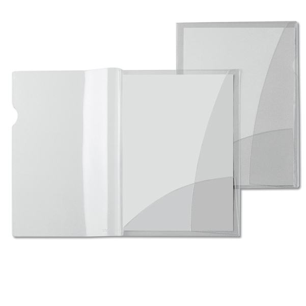 Confezione da 5 cartelline in PVC trasparente cristallo. Una tasca verticale e una tasca apribile sul secondo quadrante. Formato 21x29,7cm.