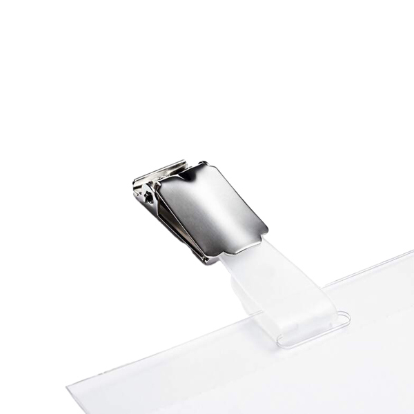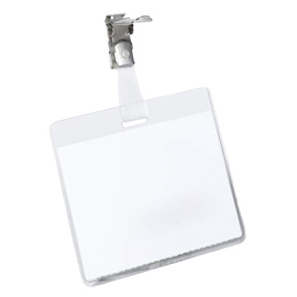 Portanome con clip in metallo orientabile che, una volta agganciata, evita la fuoriuscita accidentale dell'inserto. Trasparente crystalclear inserto in cartoncino certificato pefc, incluso nella confezione. La clip e' dotata di protezione in plastica salva tessuto. Utilizzabile anche con tutti i cordoncini e chiocciole durable. Formato inserto 60x90mm (HxL).