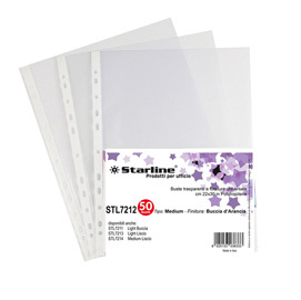Buste starline con foratura universale rinforzata. Realizzate in polipropilene trasparente finitura a buccia d'arancio antiriflesso. Formato utile 22x30cm. Codice stl7212. Modello busta trasparente a foratura universale in pp. Tipologia di spessore medio. Formato utile 22x30cm. Finitura buccia d'arancia. Foratura universale. Colore trasparente. Spessore Medio. Finitura Buccia. Antiriflesso. Foratura universale rinforzata. Dimensione formato A4. Confezione da 50 buste.