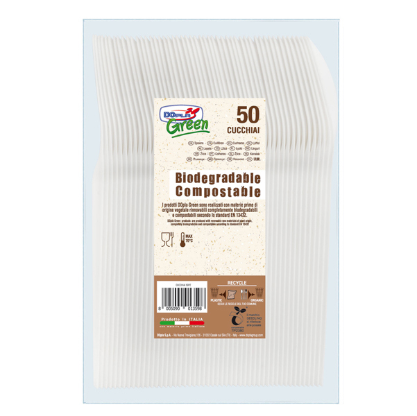 Cucchiai di colore avorio in Estabio compostabile e biodegradabile in conformita' alla norma EN 13432. Per alimenti Max 70 gradi C. Lunghezza 180mm - Peso unitario 5,7gr . Compostabili e biodegradabili.