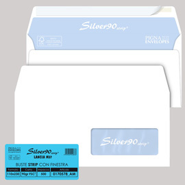 Busta bianca internografata 90gr con finestra in triacetato opaco. Formato busta 110mm X 230mm. Formato finestra 40mm x 100mm. Con strip.