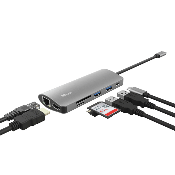 Raffinato adattatore multiporta in alluminio, per aggiungere porte hdmi, di rete, lettore di schede, usb-c e usb al laptop, utilizzando un'unica connessione usb-c. Aggiungi al laptop o al tablet ulteriori porte hdmi, di rete, lettore di schede, usb e usb-c, utilizzando un'unica porta usb collega un monitor o la tv tramite la porta hdmi. Iimmagini ad altissima risoluzione in colori ricchi, grazie a hdr e hdmi 1.4 (4k 30 hz). 2 porte usb per accessori come tastiera, mouse e drive esterni. Supporta il trasferimento rapido dei dati (5 gbps). Carica il tuo macbook o altri laptop di tipo c attraverso la porta di ricarica usb-c (fino a 100 w). La porta di rete con supporto gigabit ethernet per una connessione internet affidabile e stabile. Lettore di schede con slot per schede sia sd che micro sdr affinato alloggiamento in alluminio di lunga durata. Sottile e compatto, facile da portare con se' in viaggio. Funziona con qualsiasi laptop, macbook e tablet dotati di porta usb-c- supporta power delivery per ricariche ad alta energia (fino a 5 a / 100 w)- . La compatibilita' con i tablet android puo' variare in base all'implementazione usb-c.