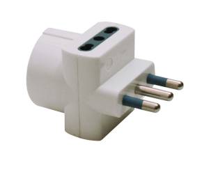 Adattatore di rete triplo, spina standard italiano 2P+T 16 A, 2 prese con alveoli schermati a ricettivitÓ multipla standard italiano (bipasso) 2P+T 10/16 A, 1 presa frontale con alveoli schermati standard tedesco (Schuko) 2P+T laterale e centrale 16 A.