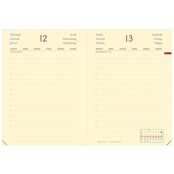 Agenda giornaliera tascabile, un giorno per pagina. 12 mesi da gennaio a dicembre, schema multilingue e pagine note intercambiabili, tasca con soffietto portabiglietti. Carta color avorio certificata PEFC stampa bicolore, rilegatura cucita e chiusura con elastico.