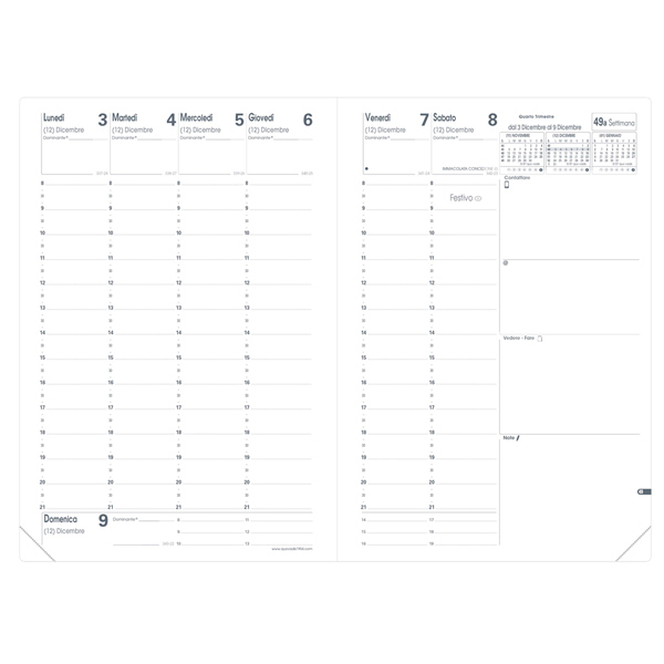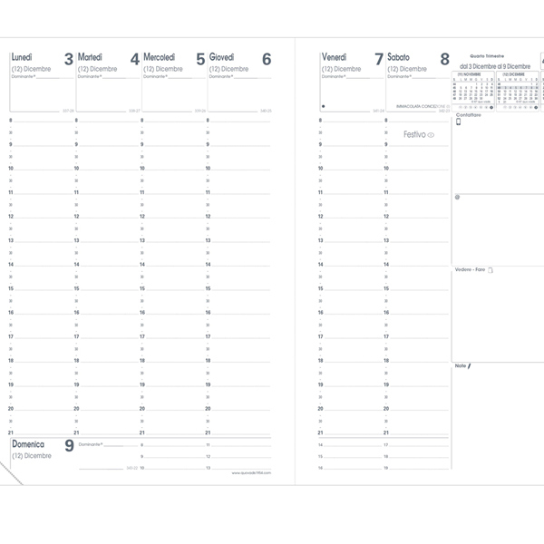 Agenda settimanale da ufficio, una settimana su due pagine. 13 mesi da dicembre a dicembre. Carta bianca certificata PEFC, stampa bicolore, rilegatura cucita. Edizione italiana.