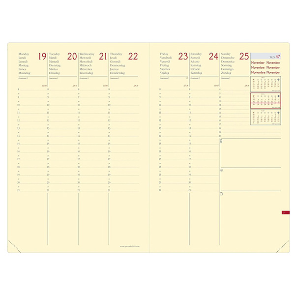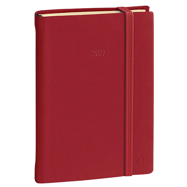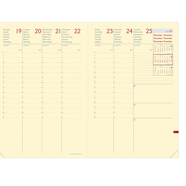 Agenda settimanale da ufficio, una settimana su due pagine. 13 mesi da dicembre a dicembre, multilingua, pagine note intercambiabili. Dotata di tasca a soffietto portabiglietti, segnalibro e chiusura con elastico verticale. Carta avorio certificata PEFC, stampa bicolore, rilegatura cucita.