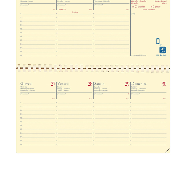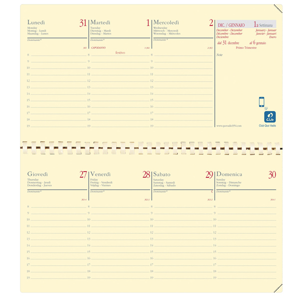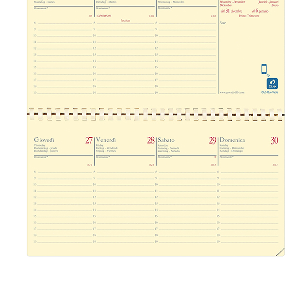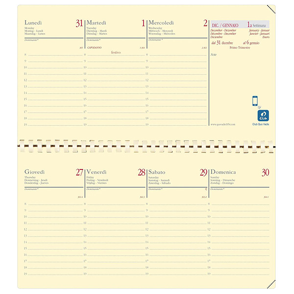 Agenda settimanale tascabile in formato orizzontale, una settimana su due pagine. 13 mesi da dicembre a dicembre, informazioni pratiche e rubrica intercambiabile. Carta avorio certificata PEFC, stampa bicolore, rilegatura con spirale. Edizione italiana.