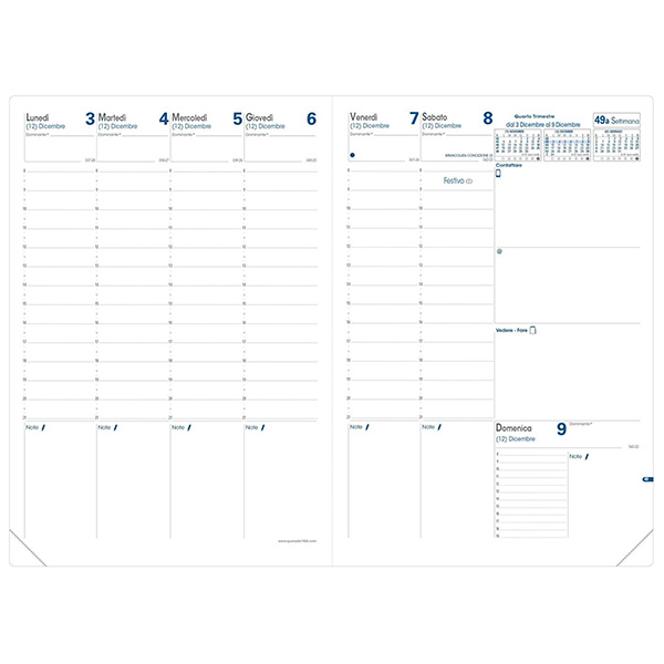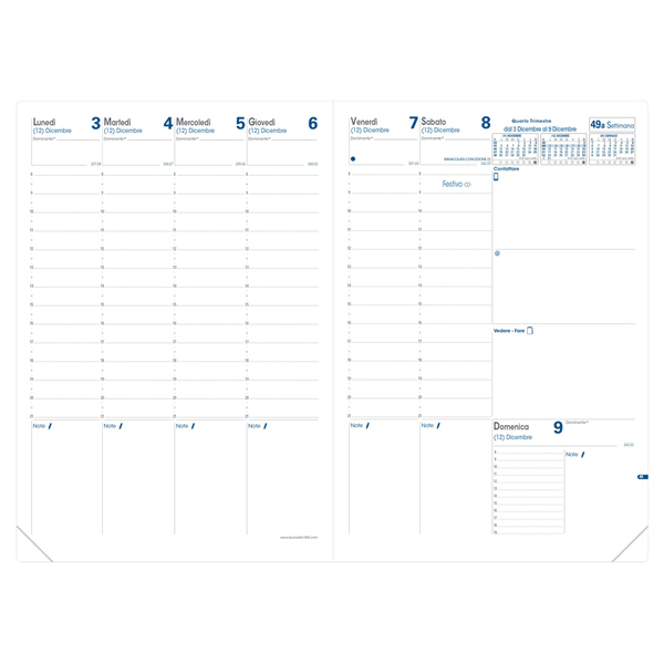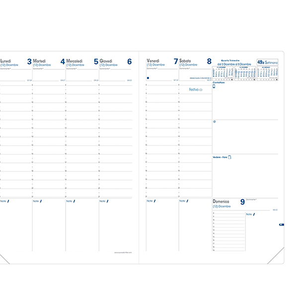 Agenda settimanale da ufficio, una settimana su due pagine con annotazioni giornaliere. 13 mesi da dicembre a dicembre. Carta bianca certificata PEFC stampa bicolore, rilegatura cucita. Edizione italiana.