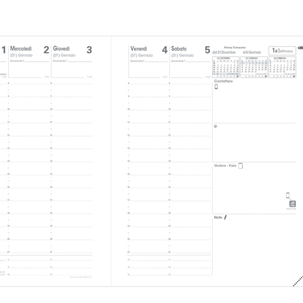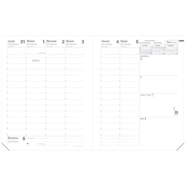 Agenda settimanale da ufficio, una settimana su due pagine. 13 mesi da dicembre a dicembre. Carta bianca certificata PEFC, stampa bicolore, rilegatura cucita. Edizione italiana.