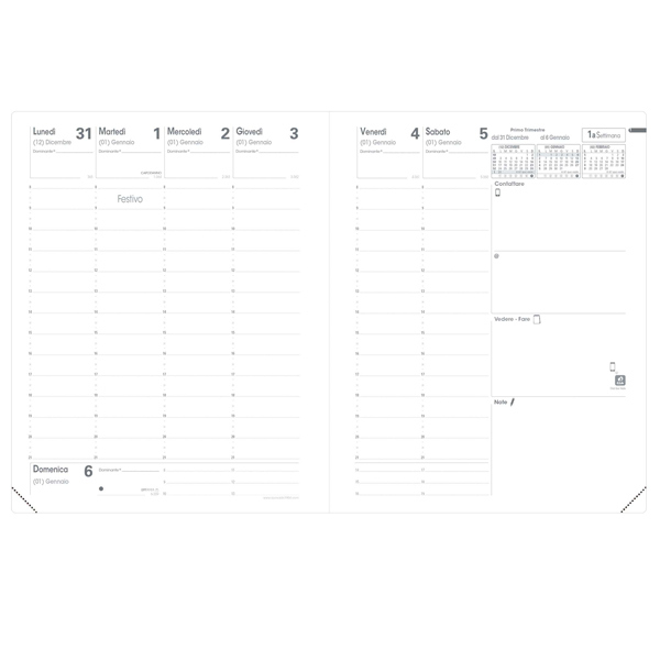 Agenda settimanale da ufficio, una settimana su due pagine. 13 mesi da dicembre a dicembre. Rubrica intercambiabile. Carta bianca certificata PEFC, stampa bicolore, rilegatura cucita. Edizione italiana.