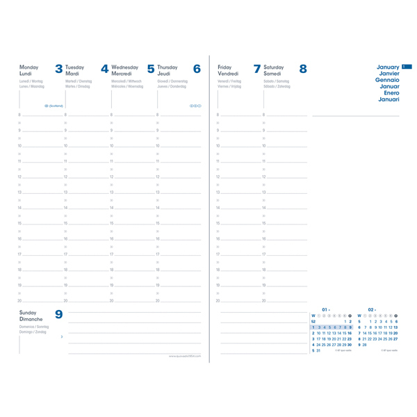 Articolo in prenotazione, in consegna a partire dal mese di luglio 2025. Agenda settimanale da ufficio, una settimana su due pagine. 13 mesi da dicembre a dicembre, rubrica intercambiabile. Carta 100% riciclata certificata Blue Angel, stampa bicolore 100% inchiostro vegetale. Copertina senza ftalati con nuovo marchio scavato elegante.