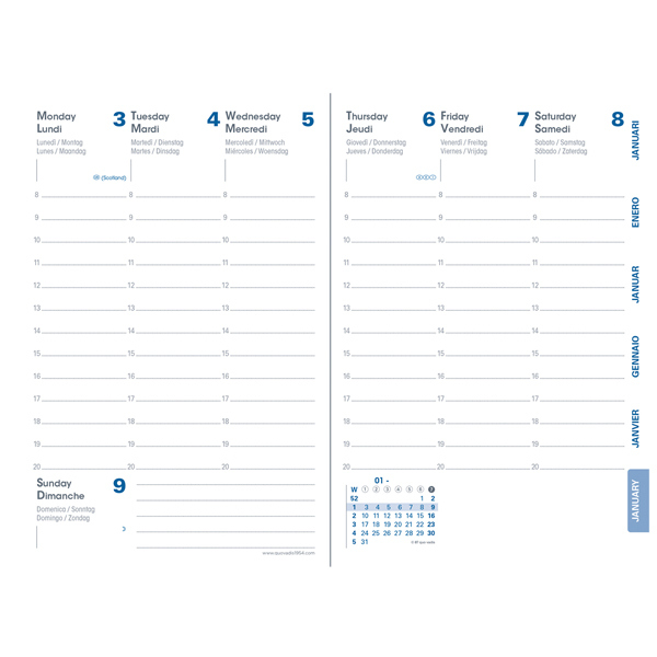 Agenda settimanale tascabile, una settimana su due pagine. 13 mesi da dicembre a dicembre, rubrica intercambiabile. Carta 100% riciclata certificata Blue Angel, stampa bicolore 100% inchiostro a base vegetale. Copertina senza pftalati. Edizione multilingue.