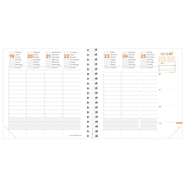 Agenda settimanale da ufficio rilegatura con spirale. Una settimana su due pagine. 13 mesi da dicembre a dicembre, rubrica amovibile, 32 pagine di appunti riposizionabili, anno-Planing pieghevole. Rivestimento in grana effetto pelle, chiusura con elastico verticale e cucitura a sellaio tono su tono. Carta bianca certificata PEFC, stampa in quadricromia. Edizione multilingue.