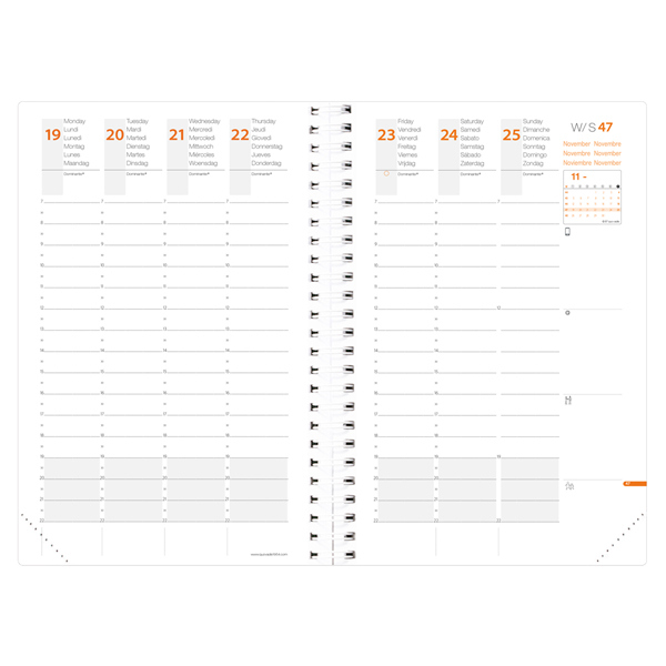 Agenda settimanale da ufficio rilegatura con spirale. Una settimana su due pagine. 13 mesi da dicembre a dicembre, rubrica amovibile, 32 pagine di appunti riposizionabili, anno-Planing pieghevole. Rivestimento in grana effetto pelle, chiusura con elastico verticale e cucitura a sellaio tono su tono. Carta bianca certificata PEFC, stampa in quadricromia. Edizione multilingue.