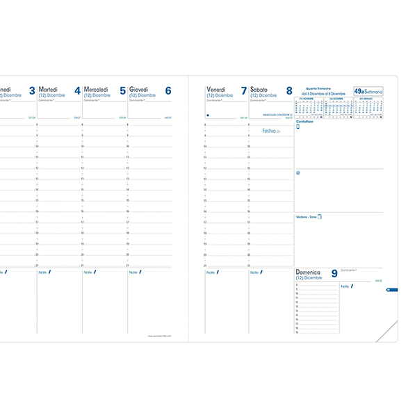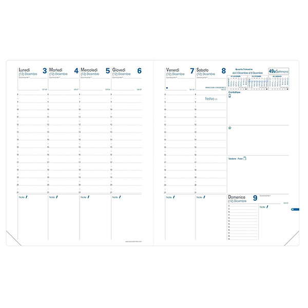 Agenda settimanale da ufficio, una settimana su due pagine con annotazioni giornaliere. 13 mesi da dicembre a dicembre. Carta bianca certificata PEFC, stampa bicolore, rilegatura cucita. Edizione italiana.