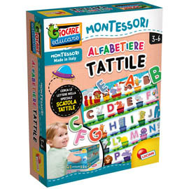 Gioco in scatola con lettere sagomate. Le letterine sono nascoste alla vista per cui il bambini, mettendo la manina nell'apposito foro, cerca le lettere nella scatola usando il tatto. Questo gioco e' in linea con il metodo Montessori perche' stimola l'esercizio della memoria tattile. Eta' consigliata 3-6 anni.