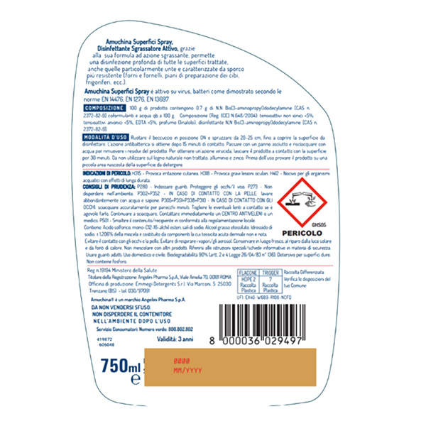 Disinfettante ad azione battericida e virucida con sgrassatore attivo che permette la disinfezione di tutte le superfici trattate, anche quelle particolarmente unte e caratterizzate dallo sporco piu' resistente (forni e fornelli, piani di preparazione dei cibi, frigoriferi, ecc.). Risulta adatto per l'igiene di tutte le superfici che vengono in contatto con i neonati e bambini (fasciatoi, seggioloni, lettini, vasche per il bagnetto, giocattoli, ecc.). In flacone da 750 ml con pratico nebulizzatore. E' un presidio medico chirurgico. Modalita' d'uso: Ruotare il beccuccio in posizione ON e spruzzare da 20-25 cm, fino a coprire la superficie da disinfettare.L'azione antibatterica si ottiene dopo 15 minuti di contatto. Passare con un panno asciutto e risciacquare con acqua per rimuovere i residui del prodotto. Per ottenere un'azione virucida, lasciare il prodotto a contatto con la superficie per 30 minuti. Da non utilizzare sul legno naturale non trattato, alluminio e zinco. Prima dell'uso provare il prodotto su una piccola area nascosta della superficie da detergere.