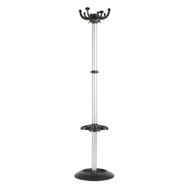Appendiabiti da terra con stelo in metallo e in plastica. Dotato di 8 supporti in plastica e testa girevole. Dimensioni 168x40cm.