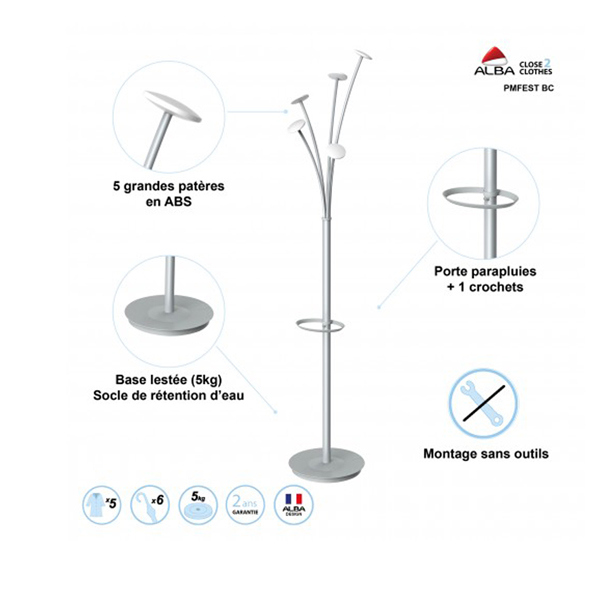 Appendiabiti in acciaio e abs con base appesantita. Dotato di 5 supporti abito e portaombrelli con raccogli acqua. Dimensioni 35x175cm.