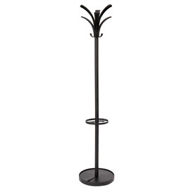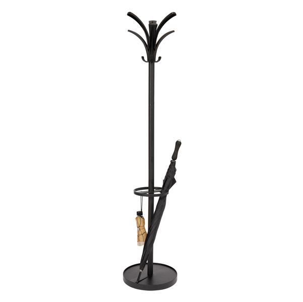 Appendiabiti in acciaio e abs con base appesantita. Dotato di 6 supporti abito, 3 ganci e portaombrelli con raccogli acqua. Testa girevole. Colore nero. Dimensione 38x175cm.