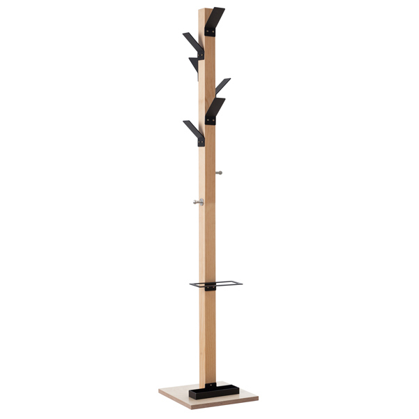 Appendiabiti in legno massello verniciato, sezione 60x60mm con 6 pomelli in polistirene resistenza agli urti e 2 pomelli in acciaio per borse, zaini ecc. Base in compensato marino verniciato 35x35cm spess. 20mm, su cui si trova la vaschetta di recupero gocce per il portaombrelli.