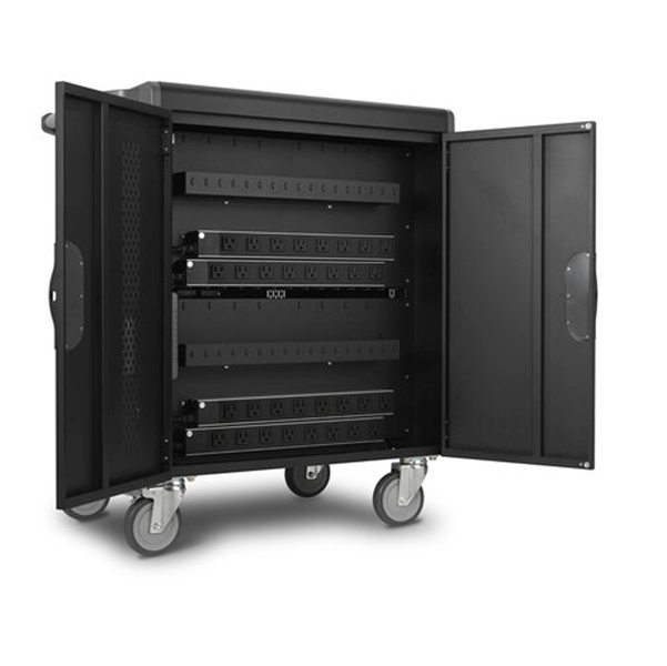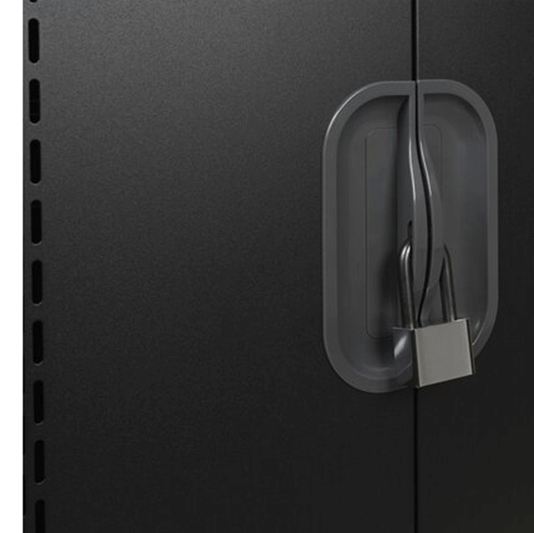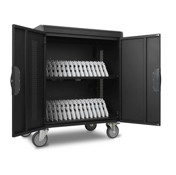 Armadietto di sicurezza Per la ricarica, il trasporto, il blocco e la conservazione comode e semplici di max. 32 dispositivi (fino a 15,6'' ciascuno). Le funzioni comprendono porte anteriori e posteriori bloccabili e un anello di attacco per il cavo di sicurezza (lucchetti e cavo di sicurezza non inclusi), separatori e organizzazione cavo integrati che non necessitano della presenza di ingombranti cavi, rotelle girevoli bloccanti da 5'' che non lasciano segni e consentono un semplice spostamento su superfici sterrate e irregolari, tecnologia di ricarica intelligente che da' automaticamente priorita' ai dispositivi che ne hanno piu' bisogno e una ricarica piu' efficiente. E' inoltre dotato di una maniglia.