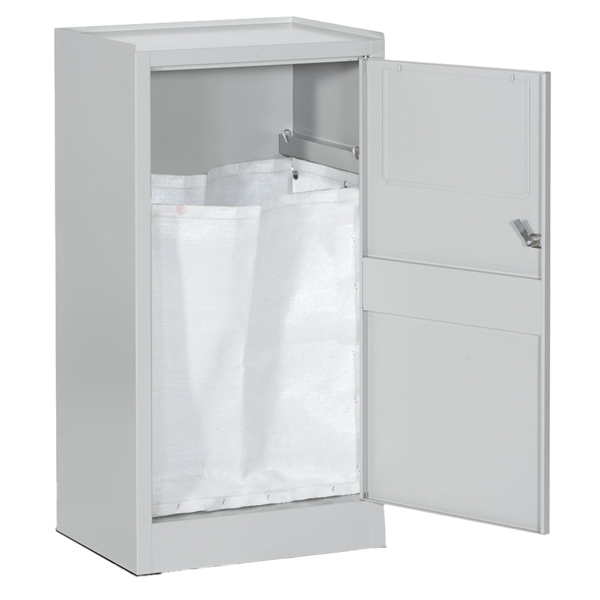 Armadietto portabiancheria in lamiera di acciaio pressopiegata a freddo spessore mm. 7/10. Colore grigio RAL7038. Il mobile e' idoneo per lo smaltimento e il recupero di indumenti, panni e biancheria in genere. Vano interno dotato di 4 ganci in acciaio per il fissaggio del sacco di contenimento. Anta frontale con serratura a linguetta e frontalino basculante. Articolo completo di sacco interno di colore bianco in polipropilene naturale, con fondo chiuso, senza punti di sollevamento e munito di 4 anelli posizionati a 3cm dal bordo per il fissaggio ai ganci interni del mobile. Costruito a maglie resistenti, e' lavabile. Dimensioni sacco 44 x 38 x 60cm. Dimensioni armadietto: 50x40x100cm. Fornito montato.
