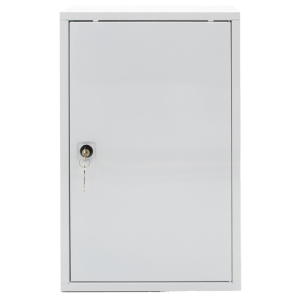 Armadietto in metallo verniciato con polvere epossidica di colore bianco. Dotato di 3 vani con 2 ripiani interni. Serratura con chiave. Dimensioni: 46x30x14cm. Contenuto: kit allegato 1 + termometro + sfigmomanometro.