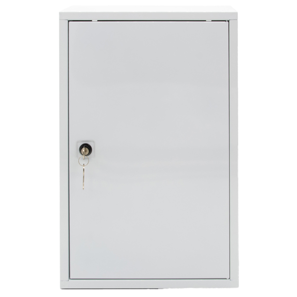 Armadietto in metallo verniciato con polvere epossidica di colore bianco. Dotato di 3 vani con 2 ripiani interni. Serratura con chiave. Dimensioni: 46x30x14cm. Contenuto: kit allegato 1, termometro e sfigmomanometro.