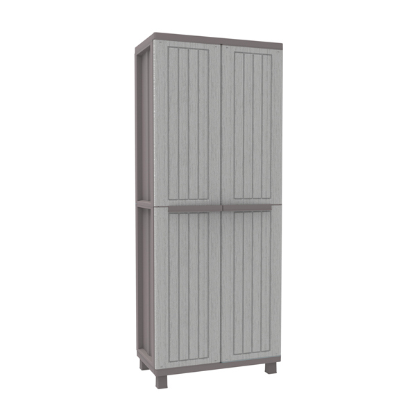 Linea di armadi modulari con robusta struttura in PPL ed elegente finitura legno color tortora. Gli armadi hanno ante apribili a 180 gradi e ripiani regolabili. Piedini rialzati e predispozizione per il lucchetto. Adatto sia per ambienti interni che esterni. Armadio a 2 ante portascope conscaffalino interno a 4 ripiani. L68cmx P37,5 cm.xH170 cm.
