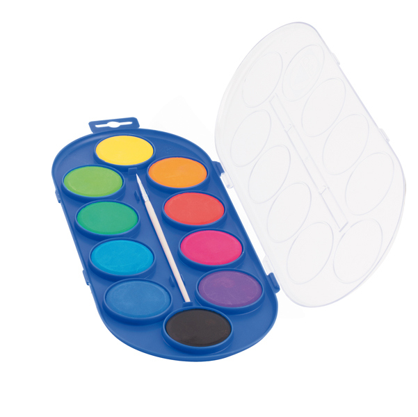 Astuccio in polistirene da 10 pastiglie da gradi 44mm assortite in 10 colori con pennello. Scatola appendibile.