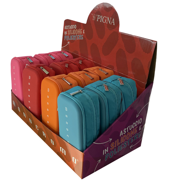 Astuccio rettangolare in silicone e poliestere. Dotato di ampia tasca portaoggetti ed ulteriore scomparto con 4 elastici portapenne. In 4 colori assortiti (azzurro, arancione, corallo e fucsia).