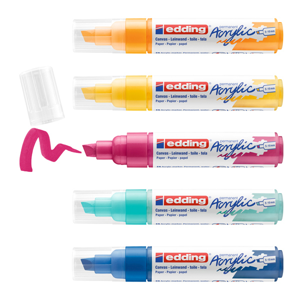 Colori acrilici di alta qualita' in un pratico marcatore. Garantisce una elevata coprenza, colori brillanti, tenuta permanente, rapida asciugatura, resistenza all'acqua e luce, inodore. Adatto a supporti come tela e carta. Set da 5 marcatori punta largo in colori assortiti: turchese, blu, giallo, giallo sole e magenta. Colori assortiti Broad Abstract.