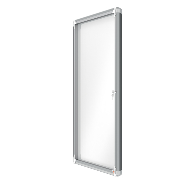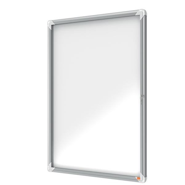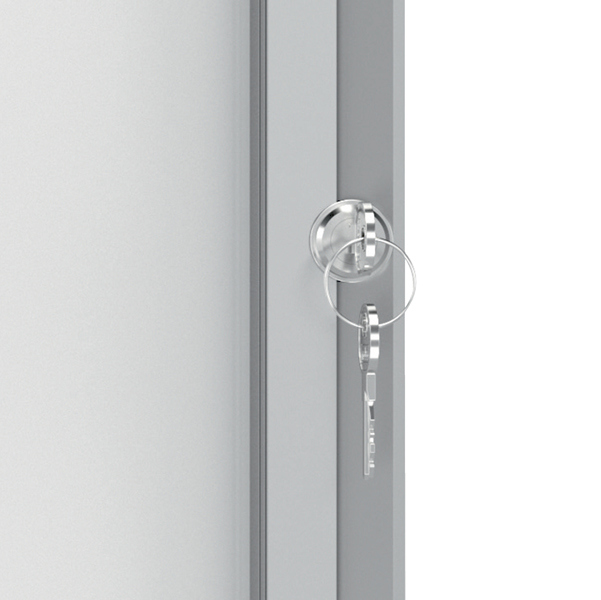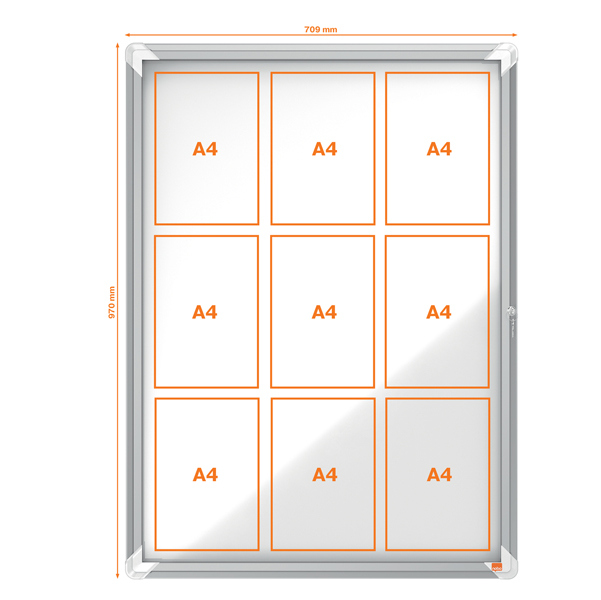Ad anta battente. Moderna, sicura e resistente all'umidita'. Nuovo design con robusta cornice in alluminio e vetro di sicurezza di 4mm. waterproof to iec 60529. Fondo in acciaio bianco magnetico per uso con magnetini o scrivibile con pennarelli a secco. Fissaggio semplice effettuabile da una sola persona. Serratura con 2 chiavi. Formato 9xa4: dim.est. 100x75,2x4,5cm.