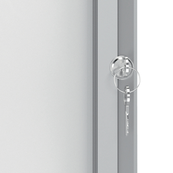 Ad anta battente. Nuovo design con robusta cornice in alluminio e vetro di sicurezza di 4mm. Fondo in acciaio bianco magnetico per uso con magnetini o scrivibile con pennarelli a secco. Fissaggio semplice effettuabile da una sola persona. Serratura con 2 chiavi. Apertura istallabile sia a destra che a sinistra. Formato 4xA4. Dimensioni esterne 692x532x37mm.