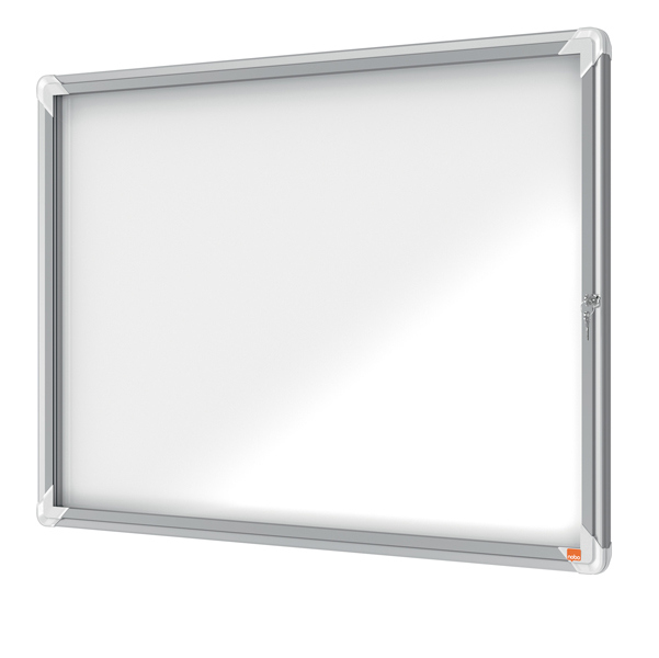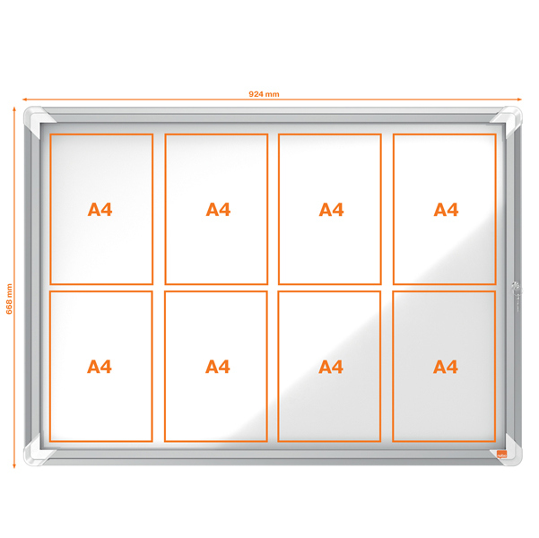 Ad anta battente. Nuovo design con robusta cornice in alluminio e vetro di sicurezza di 4mm. Fondo in acciaio bianco magnetico per uso con magnetini o scrivibile con pennarelli a secco. Fissaggio semplice effettuabile da una sola persona. Serratura con 2 chiavi. Apertura istallabile sia a destra che a sinistra. Formato 8xa4. dimensione esterna:hl69,2 x l97,2 x p3,7cm.