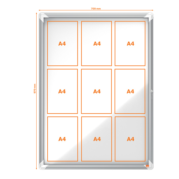 Ad anta battente. Nuovo design con robusta cornice in alluminio e vetro di sicurezza di 4mm. fondo in acciaio bianco magnetico per uso con magnetini o scrivibile con pennarelli a secco. Fissaggio semplice effettuabile da una sola persona. Serratura con 2 chiavi. apertura istallabile sia a destra che a sinistra. Formato 9xa4: dim.est. 1000x752x37mm.