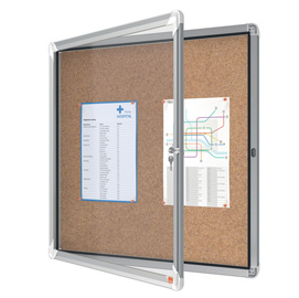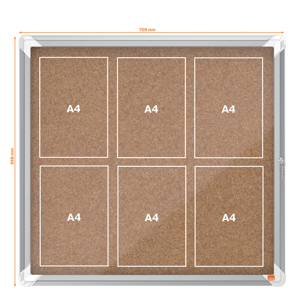 Ad anta battente. Nuovo design con robusta cornice in alluminio e vetro di sicurezza di 4mm. fondo fondo in sughero per uso con puntine. Fissaggio semplice effettuabile da una sola persona. Serratura con 2 chiavi. Apertura istallabile sia a destra che a sinistra. Formato 6xa4. DImensioni: 70,8x66,7x4,3cm.