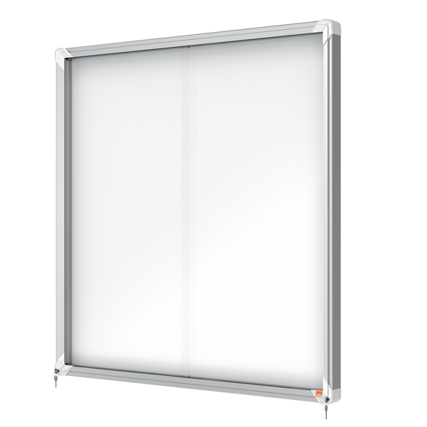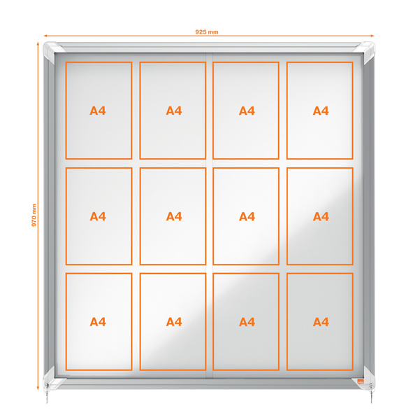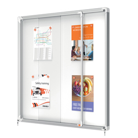 Ad ante scorrevoli. Nuovo design con robusta cornice in alluminio e vetro di sicurezza di 4mm. fondo fondo in acciaio bianco magnetico per uso con magnetini o scrivibile con pennarelli a secco. Fissaggio semplice effettuabile da una sola persona. Chiusura con doppia serratura. Formato 12xa4: dim.est. 1000x972x54mm.